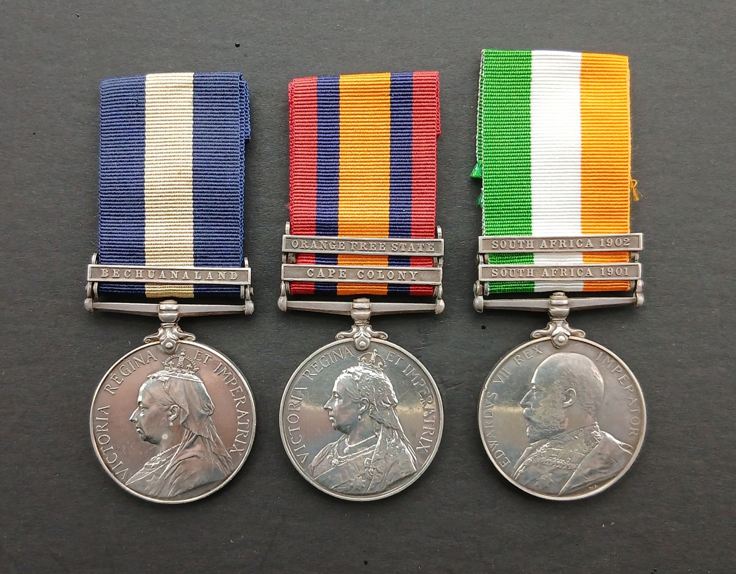 Cape of Good Hope General Service Medal clasp Bechuanaland (27 CPL. L.D. ELS. C.POL.); Queens South Africa Medal clasps Cape Colony, Orange Free State (27 CPL. L.D. ELS. CAPE P.D.1.); Kings South Africa Medal clasps South Africa 1901, South Africa 1902 (27 SERJT: L.D. ELS. C.P.DIST.1.)