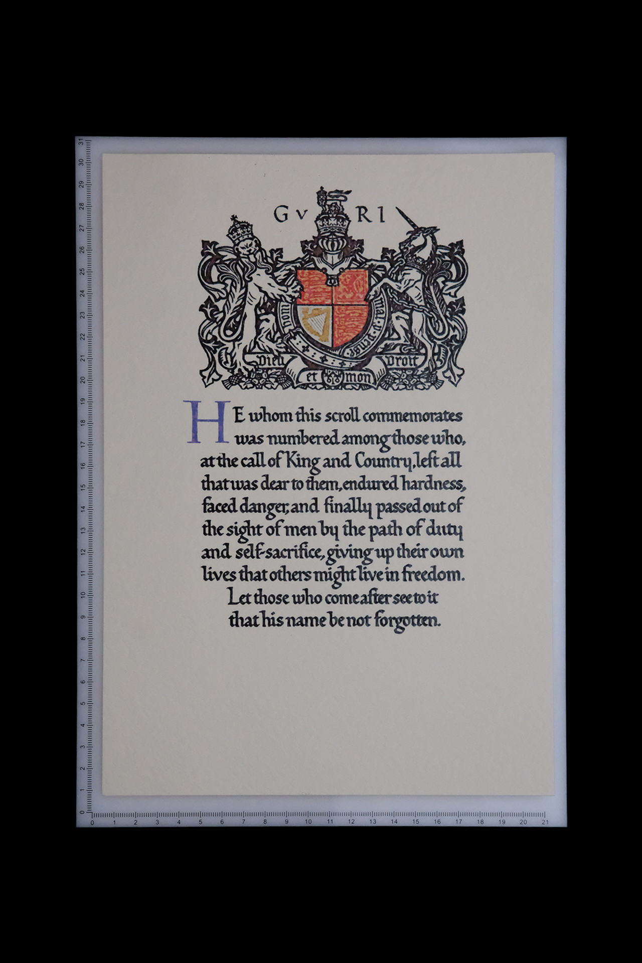 A reproduction of the scroll issued to the next of kin of those killed during the First World War. We will print the individual details at the bottom of the scroll in the same manner as the originals.