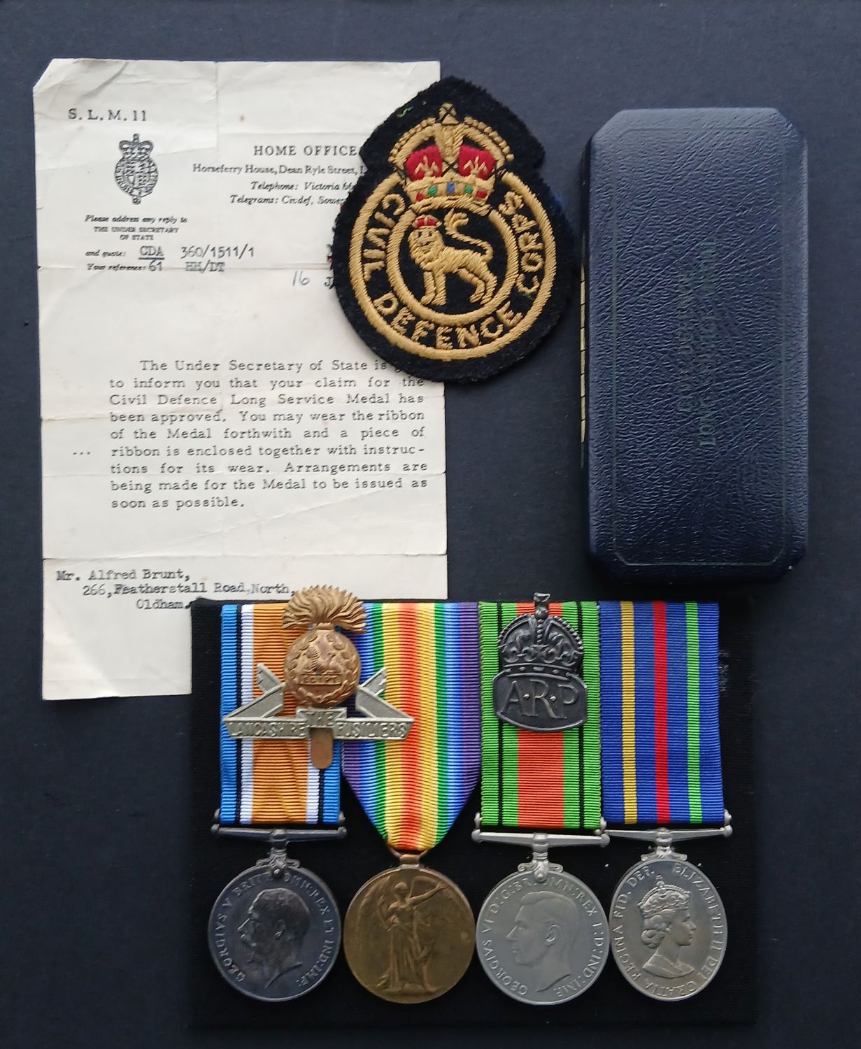 British War Medal (40812 PTE. A. BRUNT. S.LANC.R.); Victory Medal (40812 PTE. A. BRUNT. S.LANC.R.); Defence Medal; Civil Defence Long Service Medal EIIR - unnamed as awarded with Royal Mint case of issue.
