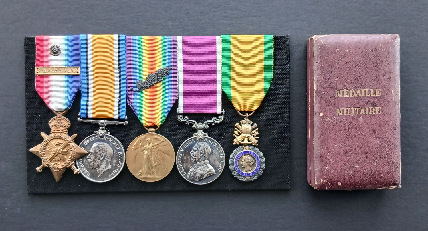 1914 Star clasp 5 Aug-22 Nov 1914 (23298 SJT. W. CARVELL. R.E.); British War Medal (23298 A.W.O.CL.2. W. CARVELL. R.E.); Victory Medal with M.I.D. Oakleaf (23298 A.W.O.CL.2. W. CARVELL. R.E.); Army Long Service & Good Conduct Medal GVR (2306367 SJT. W. CARVELL. R.C. OF SIG); Medaille Militaire - unnamed as awarded in original case of issue (scarce)